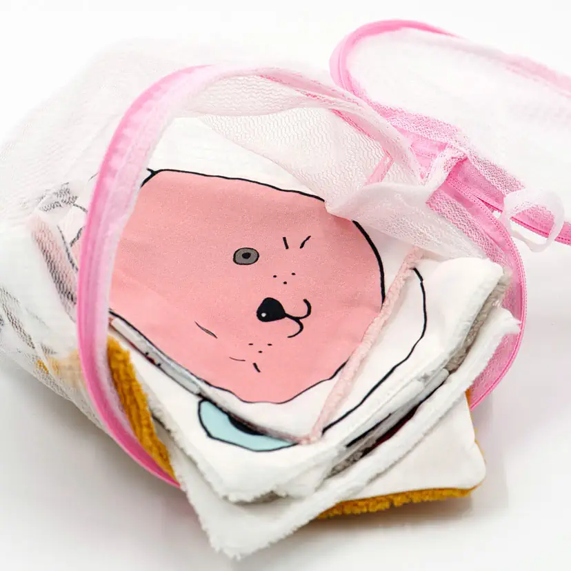 L’ensemble est fourni avec un filet de lavage offert qui se ferme avec une fermeture éclair. Voici un accessoire bien utile pour ne pas risquer de perdre les lingettes dans la machine à laver.